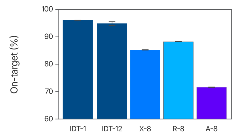Figure 2. The IDT whole exome sequencing workflow has higher on-target percentage in comparison to alternate suppliers. Sequencing libraries were prepared using enzymatic shearing and ligation-based library preparation using the library prep protocols from each vendor. Libraries were captured and multiplexed according to the vendor’s exome panel capture protocol (X-8, R-8, and A-8, where “8” signifies 8-plex captures, n=2). For IDT, we show both 1-plex (n=3) and 12-plex (n=2) captures (IDT-1 and IDT-12, respectively). Enriched libraries were sequenced on a NextSeq® instrument (Illumina) in high output mode using 2 x 100 bp paired-end reads for analysis. On-target bases were determined with Picard (percent selected bases) using 5 Gb per library.