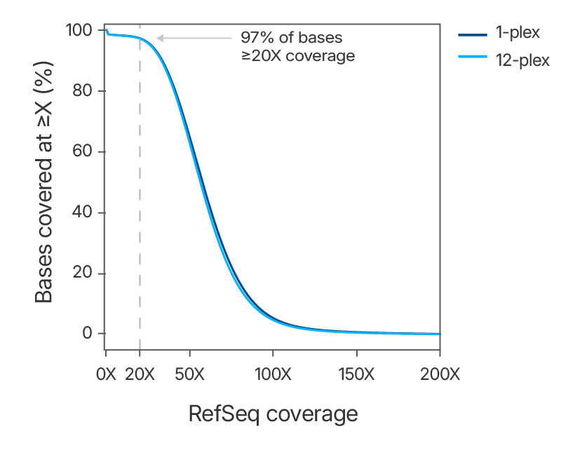 Figure 3. Consistent uniform sequence coverage with the xGen Exome Hyb Panel v2. DNA libraries were created from 100 ng of human genomic DNA (Coriell) and enriched either as 1-plex captures (n=3) or as a single
