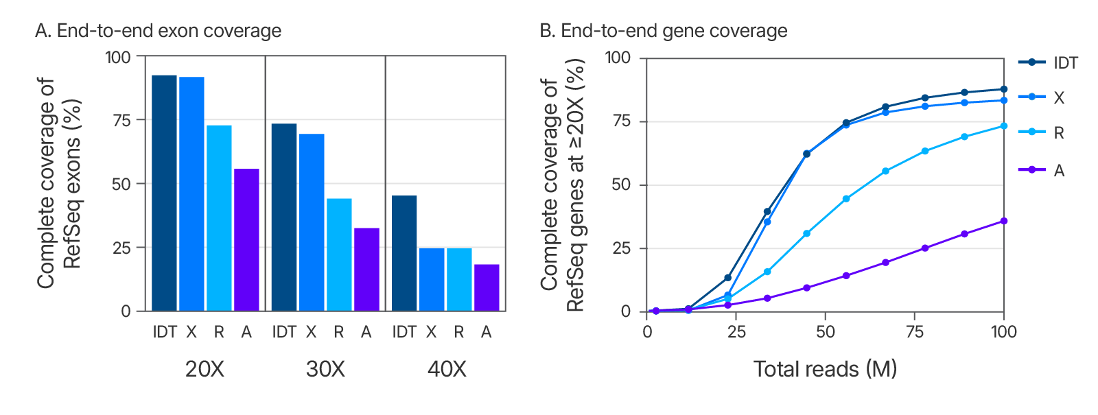 Figure 5. Exome coverage of the xGen Exome Hyb Panel v2. (A) 100 ng Coriell gDNA hybridization capture libraries (n=2) were sequenced with 5 Gb per sample while the percent of exons covered end-to-end at each read depth were calculated. The xGen Exome Hyb Panel v2 (IDT) shows the highest percentage of exons covered at each indicated depth (compared to suppliers X, R, and A). (B) The xGen Exome Hyb Panel v2 provides end-to-end RefSeq gene coverage at ≥20X. Individual samples were subsampled at different read depths (2 x 100 bp read length). The percentage of genes that were covered for every base of every exon at ≥20X was calculated at each read depth and plotted.