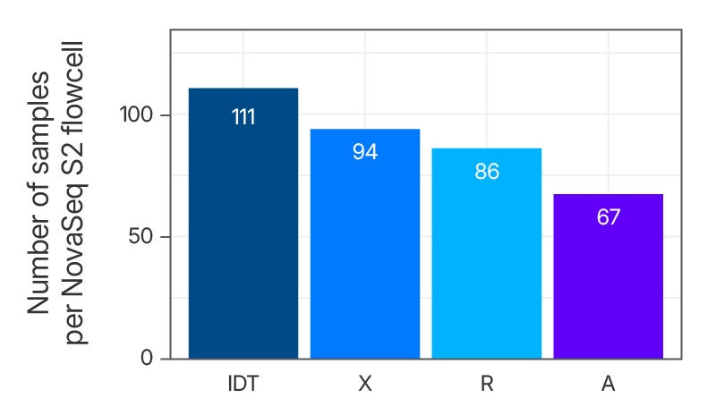 Figure 6. xGen Exome Hyb Panel v2 can increase the number of samples loaded into a flowcell. DNA libraries were created from 100 ng of human genomic DNA (Coriell) and enriched either as 8-plex, n=1 (supplier R), 8-plex, n=2 (suppliers X and A) or 12-plex, n=2 (IDT) captures. The enriched libraries were sequenced (2 x 100 bp) on a NextSeq® instrument (Illumina) and the number of reads required to achieve 75X mean target coverage (Picard) per sample was estimated along with the number of samples that would fit on a NovaSeq™ S2 flowcell (Illumina).