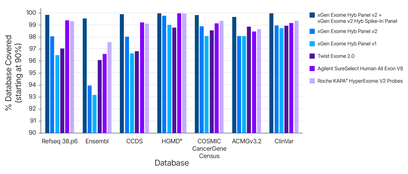 The xGen Exome Hyb Panel v2 is designed with a target-aware algorithm that minimizes off-target binding while maximizing coverage of coding regions. When combined with the xGen Exome v2 Hyb Spike-in Panel, the result is best-in-class coverage across key databases, helping you confidently capture the most critical genomic targets.